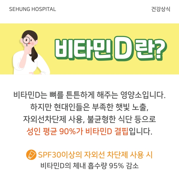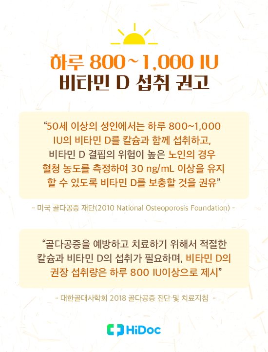 비타민 D는 칼슘의 흡수를 돕는 역할을 합니다. 그러므로 비타민 D 섭취는 칼슘 섭취와 함께 이루어져야 합니다.