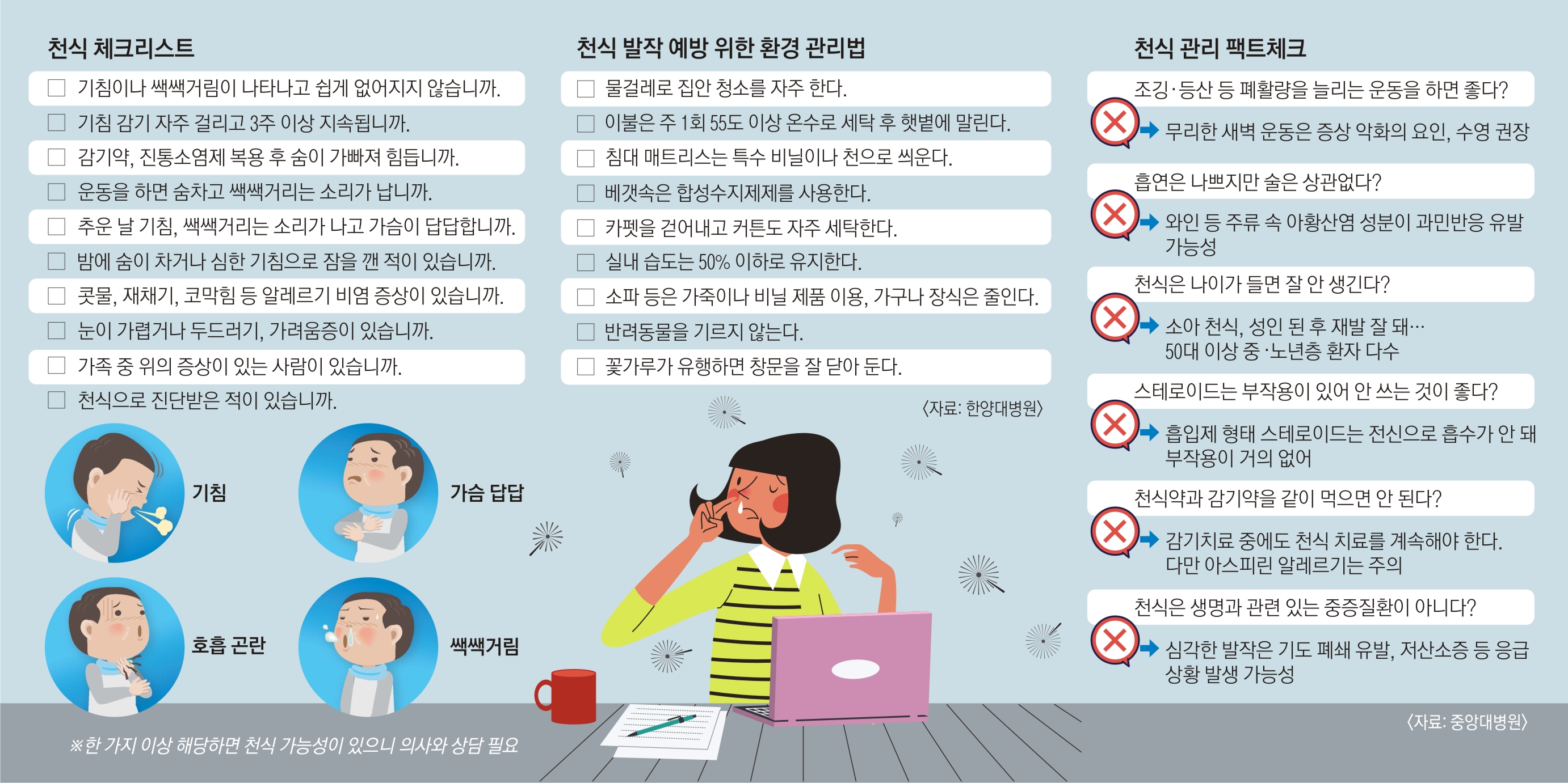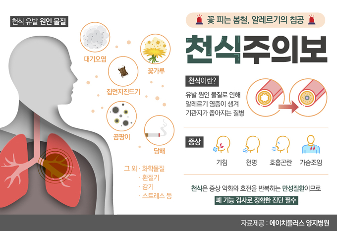 더불어 계절에 따라서도 천식이 악화될 수 있습니다. 특히 봄과 가을은 꽃가루가 많아지므로, 알레르기 반응이 유발될 수 있어 주의가 필요합니다.