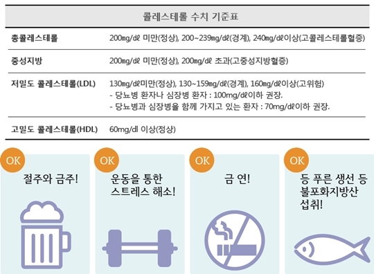균형 잡힌 식단 역시 매우 중요합니다. 채소, 과일, 통곡물, 건강한 지방(예: 올리브 오일, 아보카도, 견과류) 등을 포함한 식사를 통해 저밀도 콜레스테롤 수치를 조절할 수 있습니다.